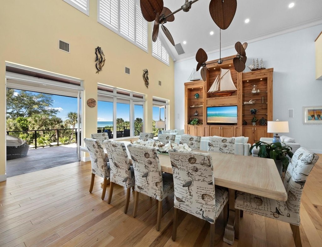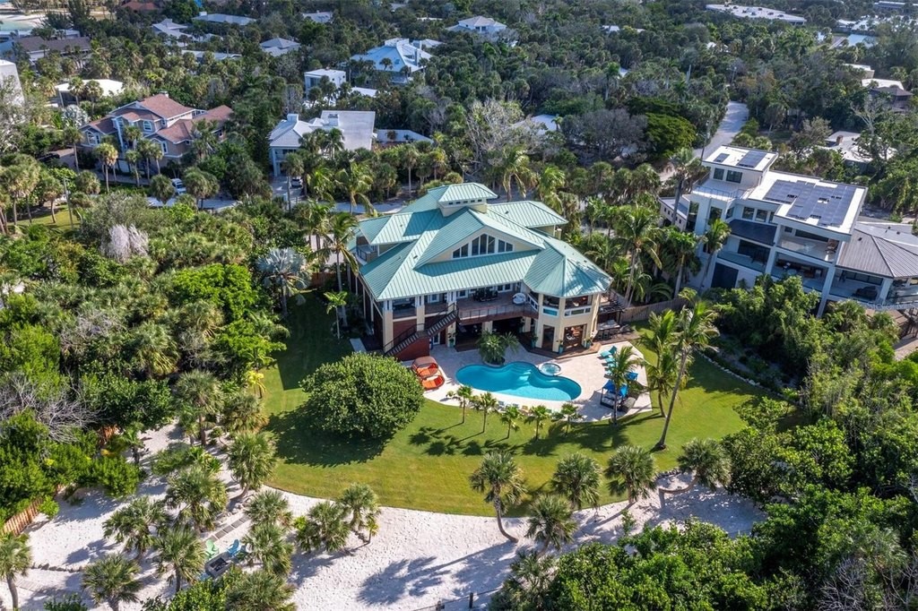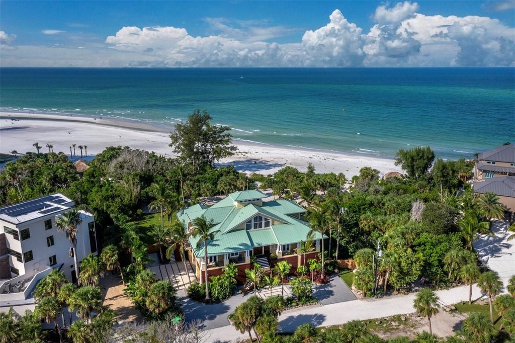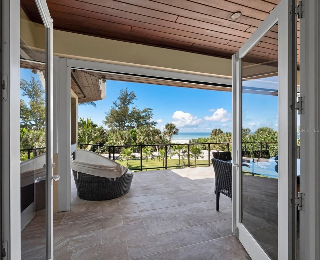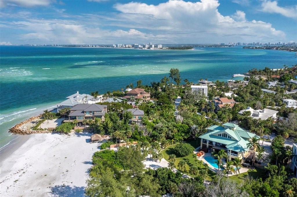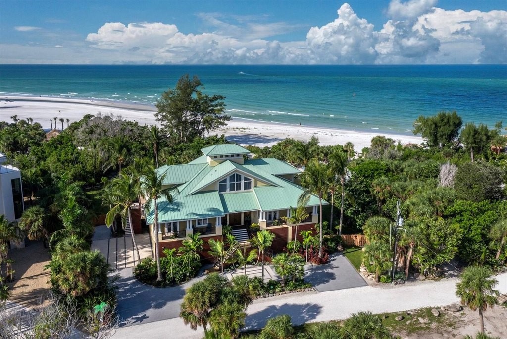 Welcome to this extraordinary Gulf-front estate located in one of Siesta Key’s most exclusive enclaves. Situated on a full acre in the private Sandy Hook community, this fully renovated, turnkey residence offers over 5,000 square feet of refined living space and more than 3,000 square feet of covered outdoor areas, all just a short stroll from Siesta Key Village and with direct access to a private community beach. Inside, the layout features five en-suite bedrooms, two powder baths, a dedicated office, and a three-car garage with beach cruisers and kayaks included. Floor-to-ceiling Andersen impact windows frame panoramic Gulf views, while rich finishes like Sapele mahogany siding, IPE hardwood decking, and a custom Pecky Cypress entertainment system reflect the home’s elevated craftsmanship. The chef’s kitchen is a showpiece, centered around a Labradorite Lumarian Blue granite island imported from Brazil, with Wolf, Miele, and Sub-Zero appliances throughout. The spa-inspired primary suite includes a waterfall feature wall, dual curbless shower, lighted soaking tub, and Toto smart toilets. A private elevator and full smart-home system ensure ease and efficiency. Outdoor living is exceptional, with a heated saltwater pool and Jacuzzi, a fully equipped summer kitchen, a covered outdoor living room with fireplace and TV, a poolside theater with dual fireplaces and TVs, and a sunset-facing gas fire pit. The professionally designed $1M+ tropical landscape includes advanced mosquito-misting and irrigation systems for effortless maintenance. With direct access to a private, resident-only beach and an ideal location just minutes from restaurants, shopping, and entertainment, this one-of-a-kind estate offers a rare opportunity to experience the best of coastal living on Siesta Key. Designed for elevated living and effortless enjoyment, 26 Sandy Hook Road S is more than a home—it is a fully realized Gulf-front sanctuary.